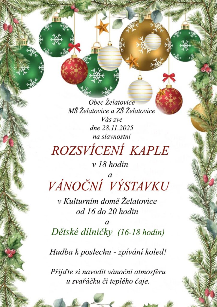 Obec Želatovice spolu s místní mateřskou a základní školou zvou všechny 28. listopadu v 18:00 hodin na slavnostní Rozsvícení kaple a na Vánoční výstavku, která bude od 16:00 do 20:00 hodin v místním kulturním domě.