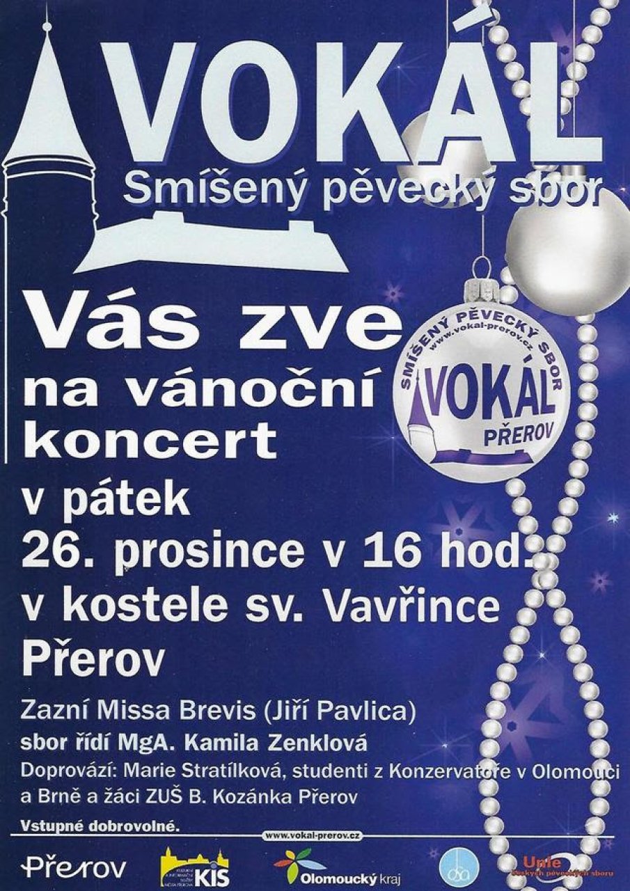 Smíšený pěvecký sbor Vokál zve všechny v pátek 26. prosince od 16:00 hodin do kostela sv. Vavřince v Přerově na vánoční koncert.
