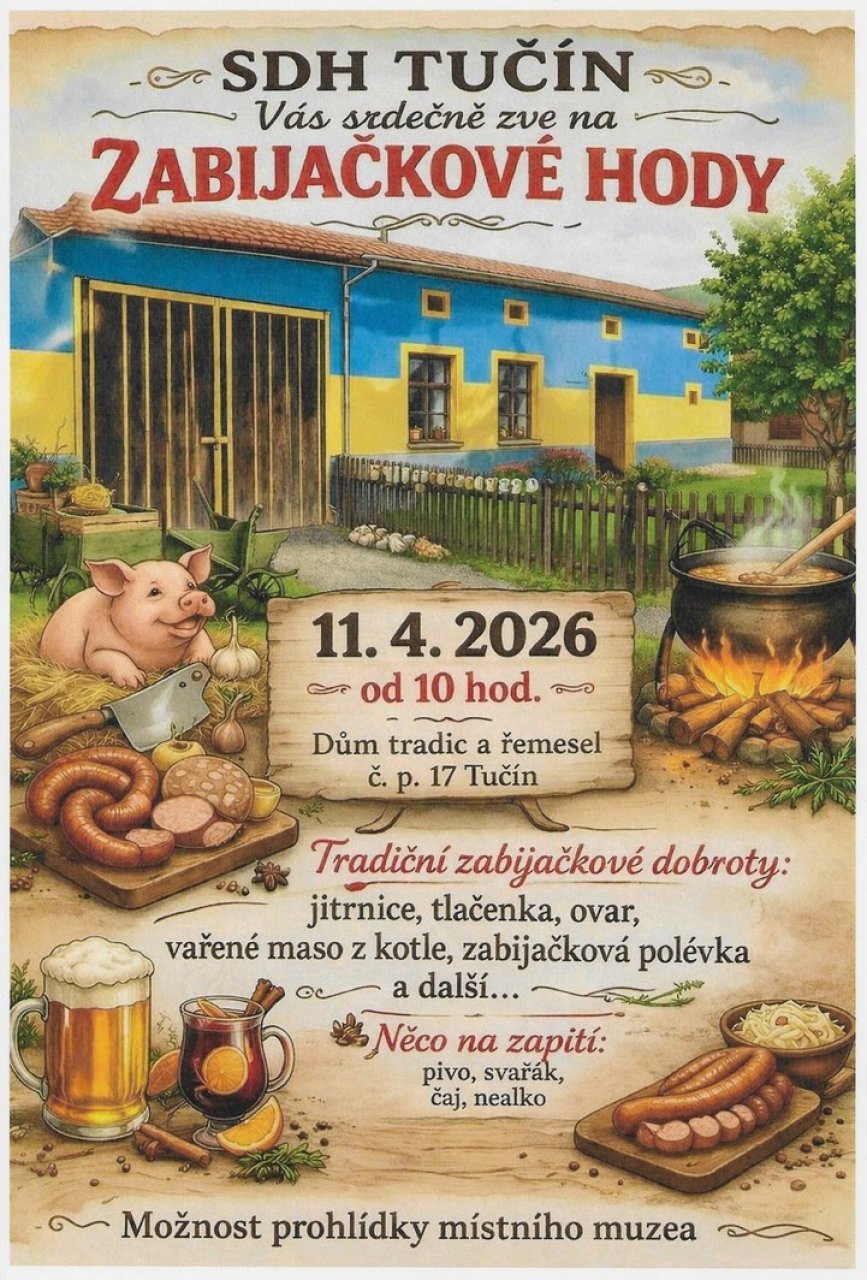 Sbor dobrovolných hasičů Tučín srdečně zve širokou veřejnost na zabíjačkové hody, které se konají v pátek 11. dubna od 10:00 hodin v Domě tradic a řemesel, č. p. 17. Návštěvníci se mohou těšit na bohatou nabídku tradičních zabíjačkových specialit připravovaných podle osvědčených receptů.