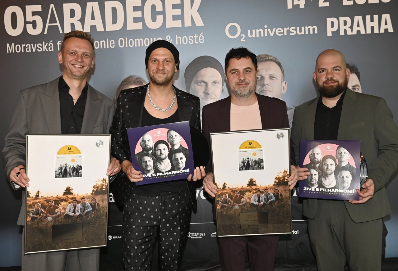 Skupina O5 a Radeček v Praze pokřtila novou společnou nahrávku s Moravskou filharmonií Olomouc. Zároveň muzikanti z jesenického podhůří převzali Platinové desky za úspěšné album HoraLove. Foto: brainzone