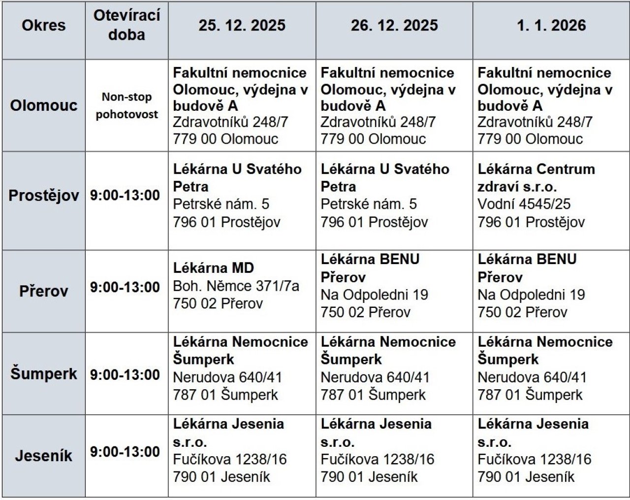Na Štědrý den většina běžných lékáren po poledni zavře. Hned následující den ale navážou právě vybrané prodejny léků – v Prostějově to bude Lékárna U Svatého Petra, v Přerově Lékárna MD, v Šumperku Lékárna Nemocnice a v Jeseníku Lékárna Jesenia.